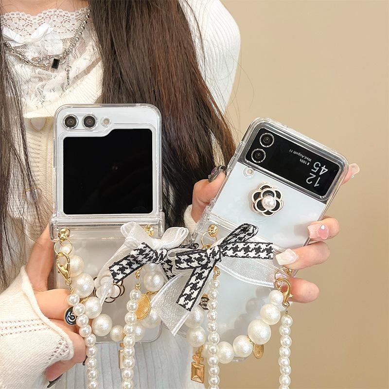 Transparent Ins Style Phone Case for Samsung Zflip6 Foldable Screen Flip W24flip Pearl Hand-held Chain Flower