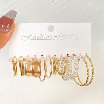 Inlaid Pearl Women's Earrings: Creative French Retro Gold Hoop Set (6 Pieces)