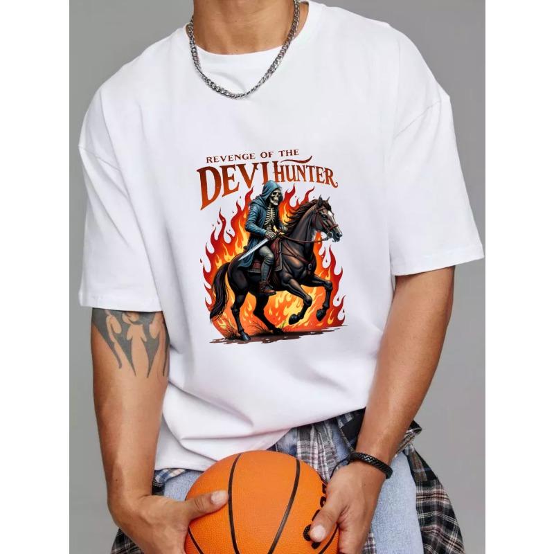 T Shirt White Revenge of The Devil Hunter Skeleton On Horse with Flames Graphic for Casual Wear