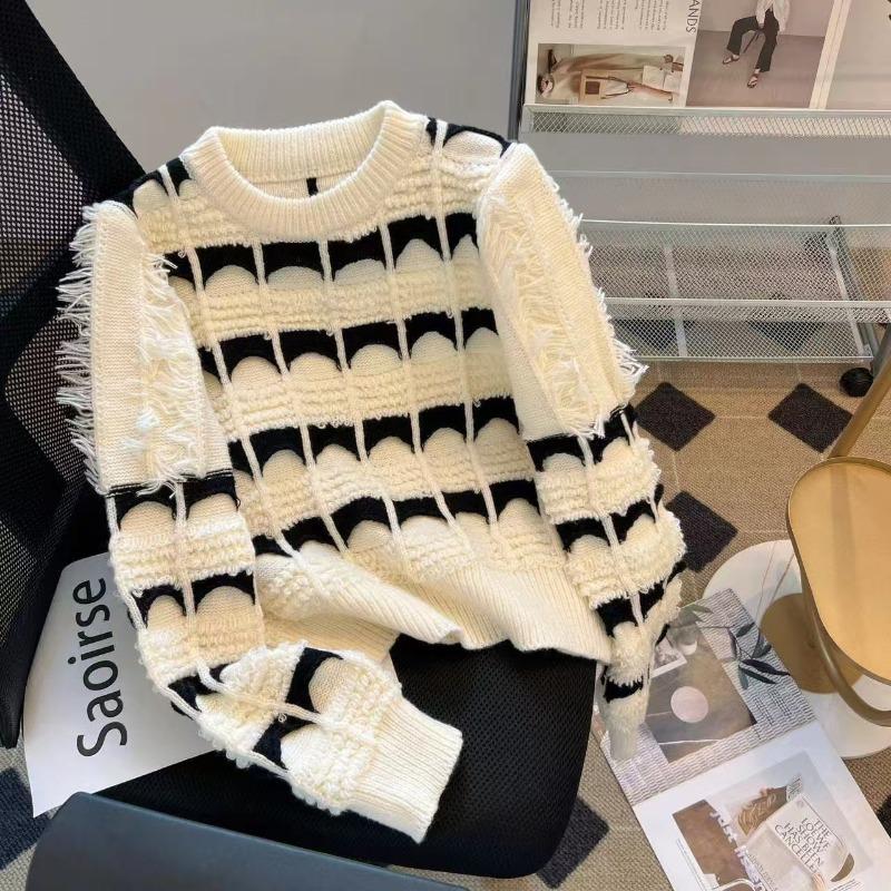 Real Shot Contrasting Color Striped Fringed Rough Edge Knitted Sweater New Niche Design Sense Fashion Chic Soft Waxy Sweater Tide