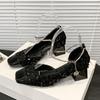 Fashion Fashion Side Empty Single Shoes Summer New Square Head Shallow Mouth Sequin Cloth Crystal Buckle Non-slip Square Heel Shoes