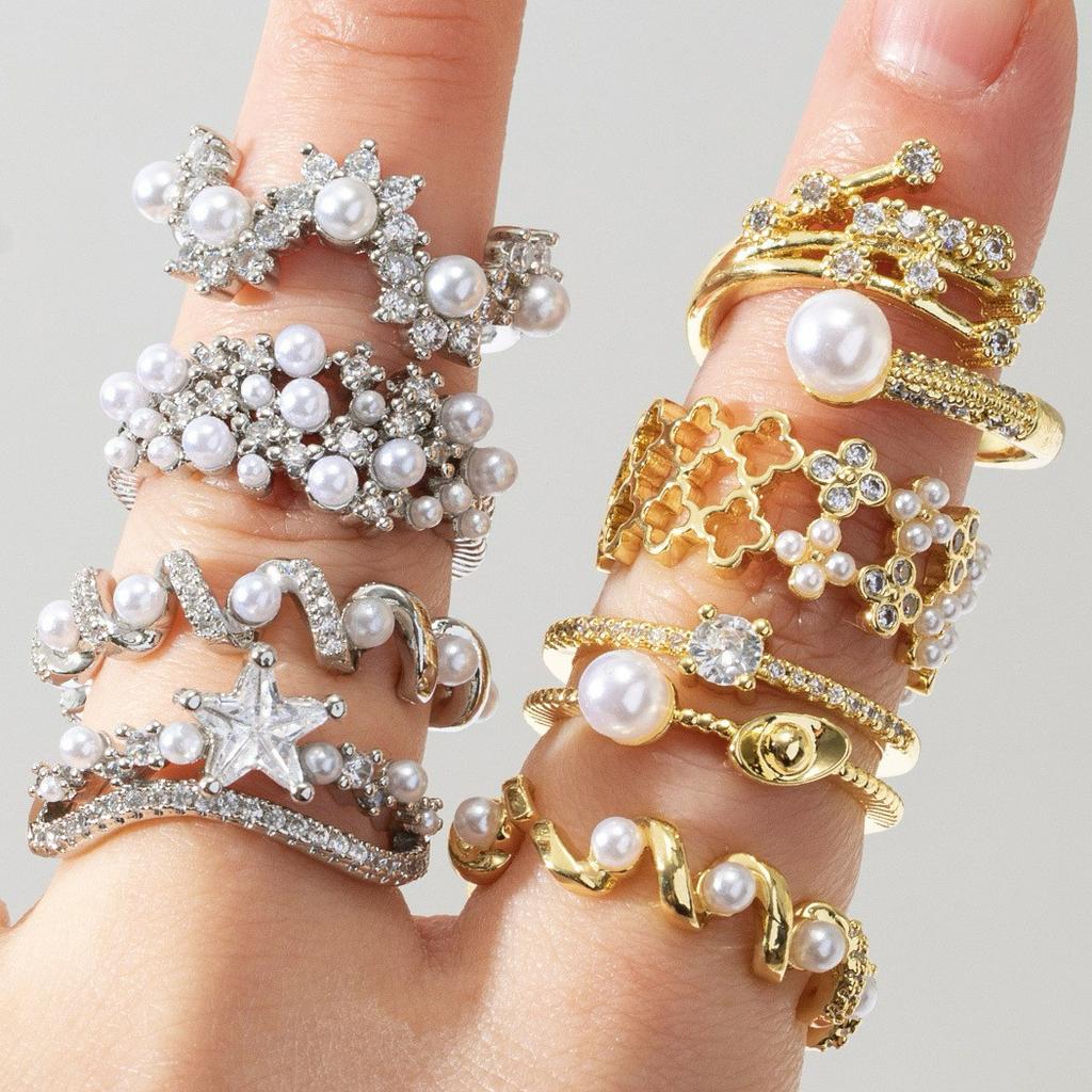 Fashion Design, Pearl Open Ring, Women's Light Luxury, Elegant and High-end Temperament, Full of Diamonds, Zircon Ring.