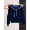 Temperament Soft Waxy Knitted Sweater Niche Long-sleeved Sweater Women's Autumn New College Style Navy Collar Shawl Strap Top