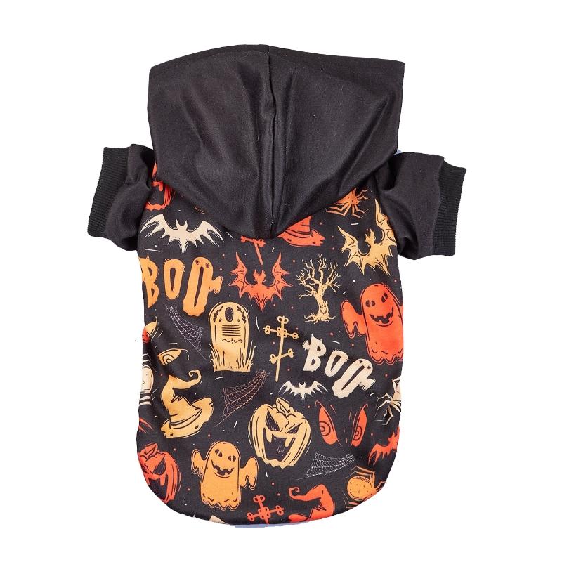 Halloween Pet Hoodie with Ghost, Bat & Tombstone Prints, Black Pet Sweatshirt with Hood for Small Dogs/Cats Festive Outfit
