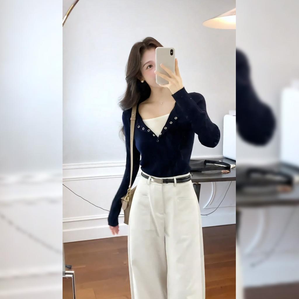 Navy Blue Slim-fitting Short Fake Two-piece Bottoming Knitted Sweater, Autumn and Winter New Contrasting Color Nail-button Sweater, Inner Top Women