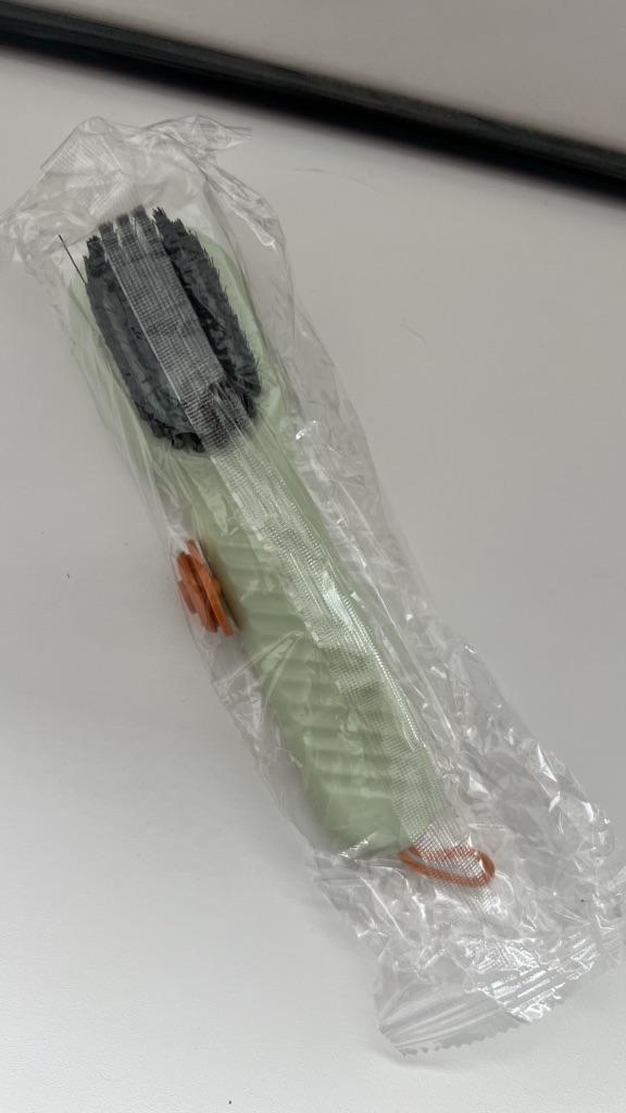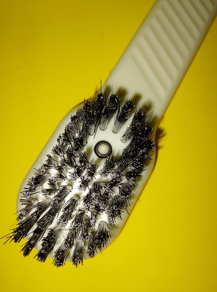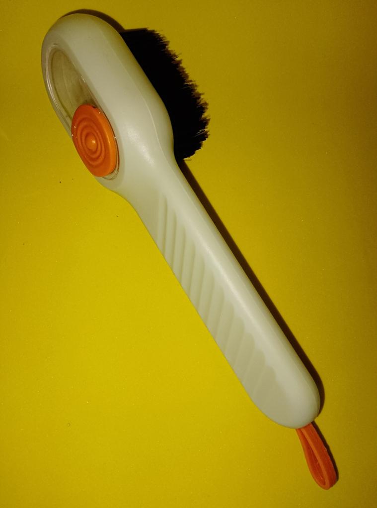this is a multi-purpose cleaning brush. Although it looks like an ordinary brush, its compact design and the density of its bristles make it the perfect tool for those details that we usually overlook. What I like the most is the firmness of its black bristles. They are rigid enough to dislodge stubborn dirt in tile joints or edges of faucets, but maintain the necessary flexibility not to scratch surfaces. The handle has an ergonomic design with grooves that facilitate grip, something that is appreciated when you have wet or soapy hands. In addition, the detail of the small orange cord is very practical for hanging it up and allowing it to dry quickly, preventing it from accumulating moisture. It is ideal for cleaning sneakers, going over the corners of the countertop, or even for removing dust from thicker textiles. It is a basic accessory, but its durability and effectiveness make it stand out over conventional brushes.