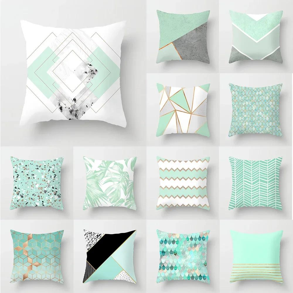 Mint Green Geometric Printed Pattern Cushion Cover for Home Living Room Sofa Decoration Square with Polyester Pillowcase