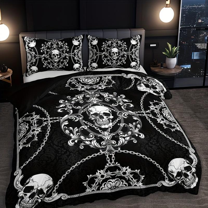 3pcs Breathable Polyester Skull Print Bedding Set - Machine Washable, Includes 1 Duvet Cover & 2 Pillowcases, Perfect for All