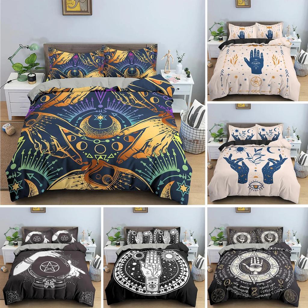 Sun Moon Bedding Set Mystical Lucky Hand Duvet Cover Full King Hamsa Eye Divination Seedlings Khaki 2/3PCS Polyester Quilt Cover