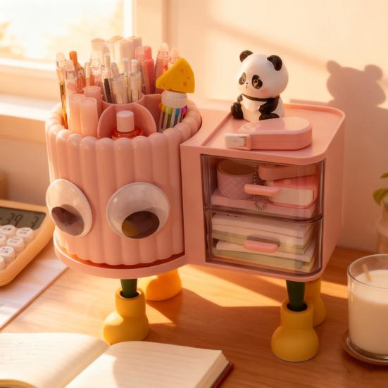 Innovative Two-In-One Rotating Design: Combining a rotatable pen holder with a fixed drawer, this design allows quick access to all supplies with a simple turn. It eliminates the frustration of rummaging through clutter, helping children focus better on their studies while keeping the desktop tidy and efficient.