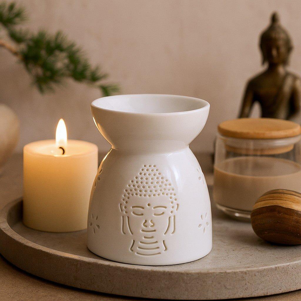 The smooth white finish and rounded lines feel calm under the hand. Openwork cutouts form a stylised Buddha face with small star‑like perforations, letting the candlelight breathe through the base in a soft glow. A gently tapered base supports the integrated bowl for steady warmth and airflow. In many traditions, the Buddha is a respectful symbol of compassion, mindfulness, and inner peace — often kept in quiet corners as a reminder to pause and return to the present. 🧘