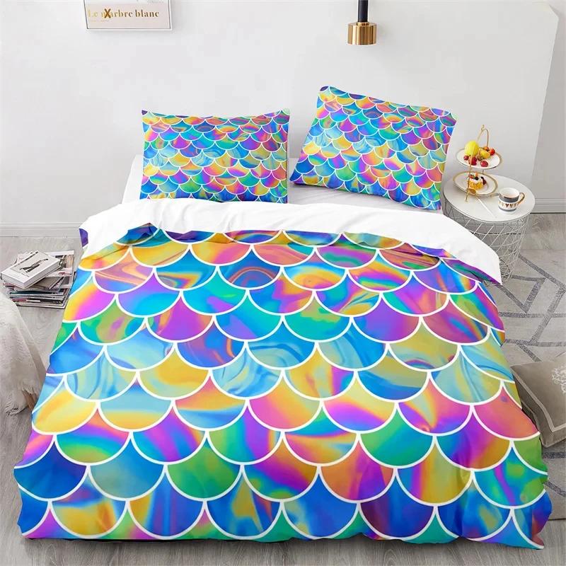 Colorful Fish Scales Bedding Set Twin King For Boys Girl Blue Pink Mermaid Skin Surface Print Duvet Cover Polyester Quilt Cover