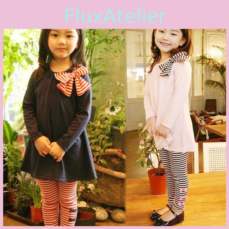 Adorable 2pcs Toddler Kids Baby Girls Outfits With Bowknot Top Striped Legging