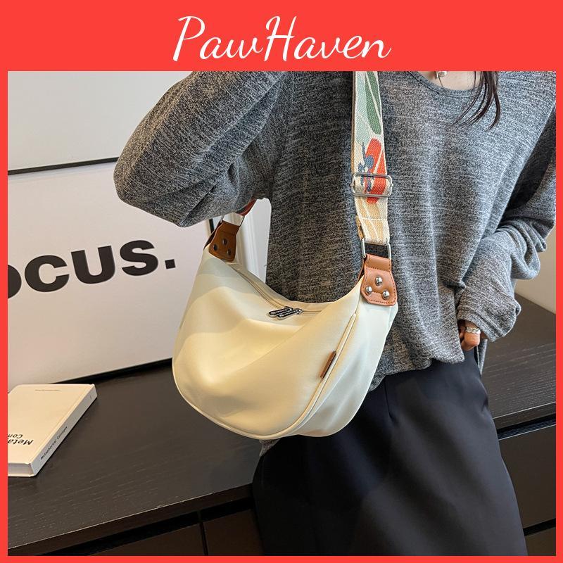 This chic dumpling-shaped bag is designed for convenience and style, featuring a wide shoulder strap for easy carrying.Made from high-quality canvas material, this bag is both lightweight and durable.