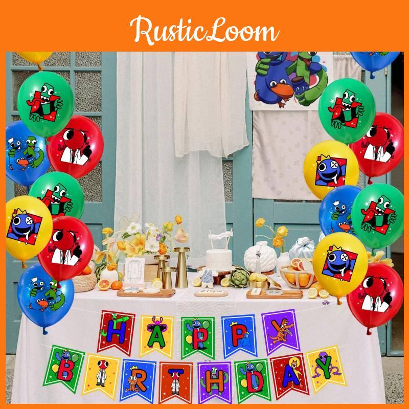 All-in-one Party Supplies Set Includes 26 Pieces Of The Rainbow Friends Theme Including Flags Big And Small Cake Toppers And Mixed Color Balloons.