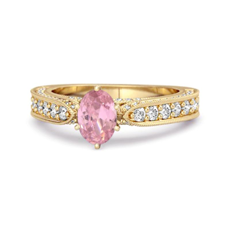 Elegant vintage-style ring with 1.18 ct pink CZ in sterling silver. Features milgrain detail and sparkling accents – perfect for romantic occasions.