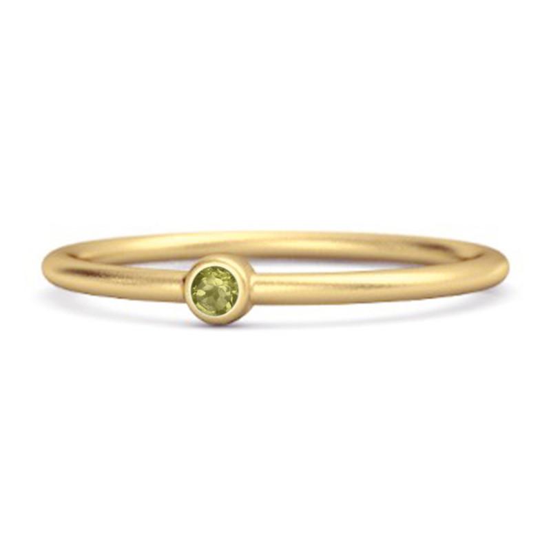 Minimalist sterling silver bezel ring with 3MM round peridot (0.10 Ct). Fresh green gemstone ring perfect for stacking or gifting.