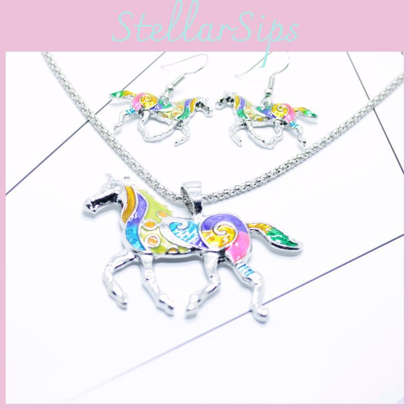 Trendy Rainbow Pony Pendant Earring Necklace Set With Colorful Gradient Design