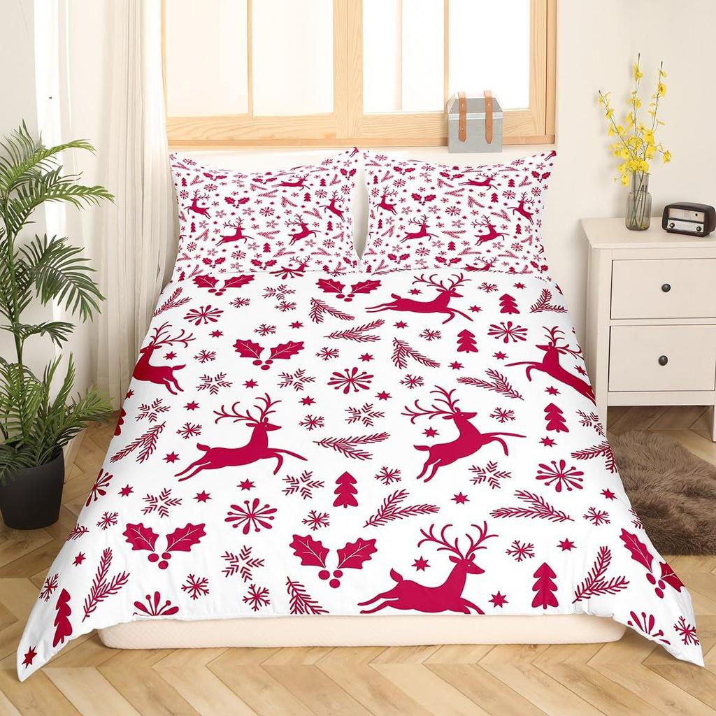 Red Three-Piece Quilt Cover Digital Printing Bedding Set Christmas Elk Snowflake Bed Cover