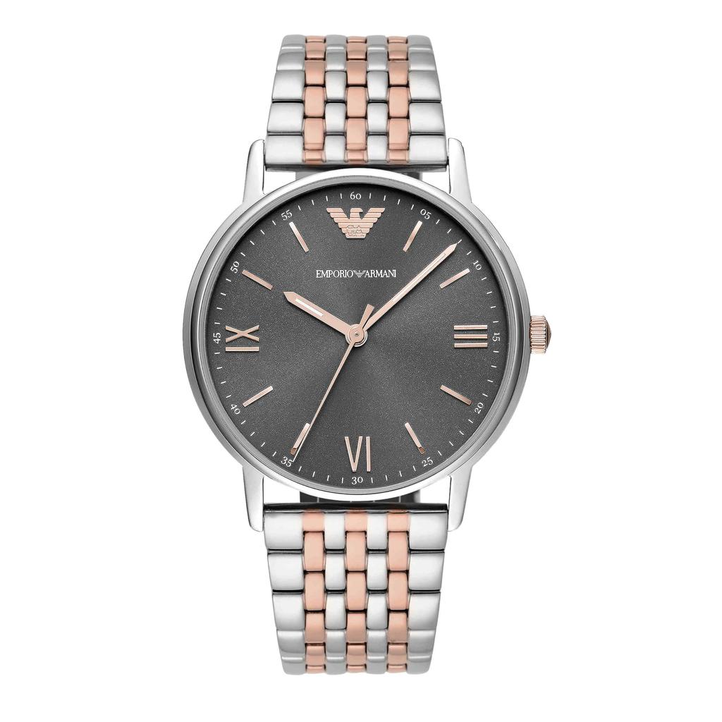 Stainless steel round case with a grey dial.
