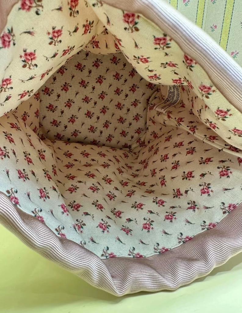 A small pink bucket with a floral pattern inside. It's so charming; I can put all my makeup in it.