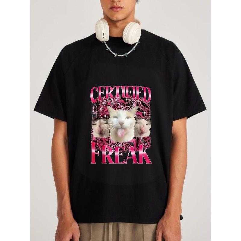 White T Shirt Certified Freak Cat Graphic Print Casual Wear for Men and Women Streetwear Fashion Statement Top