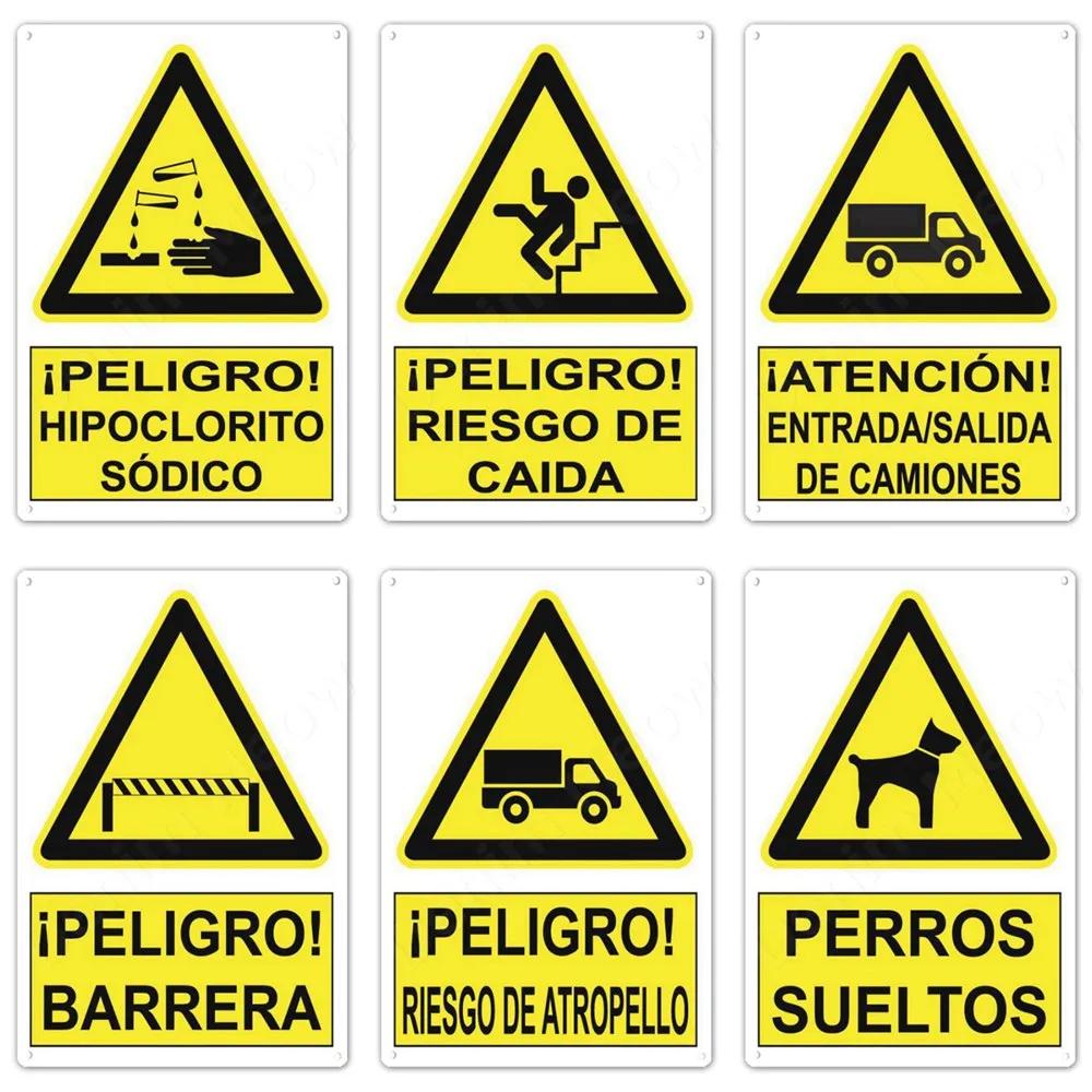 Spanish Warning Sign, Danger Metal Sign for Street, Yard, Bar, Workshop Decor, Yellow Waterproof Caution Signs, Outdoor Indoor