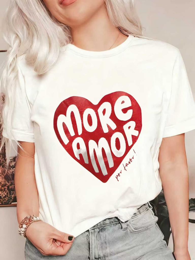 Oversize Women's Short-Sleeve T-Shirt with Red Heart and "MORE AMOR" Text Print