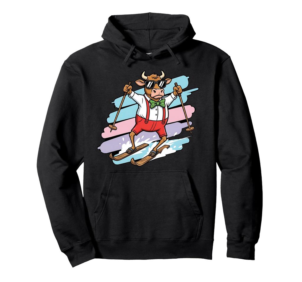 Funny Cow Ski Backcountry Snow Mountain Sunglasses Bow Tie Winter Humor Animal Hoodie