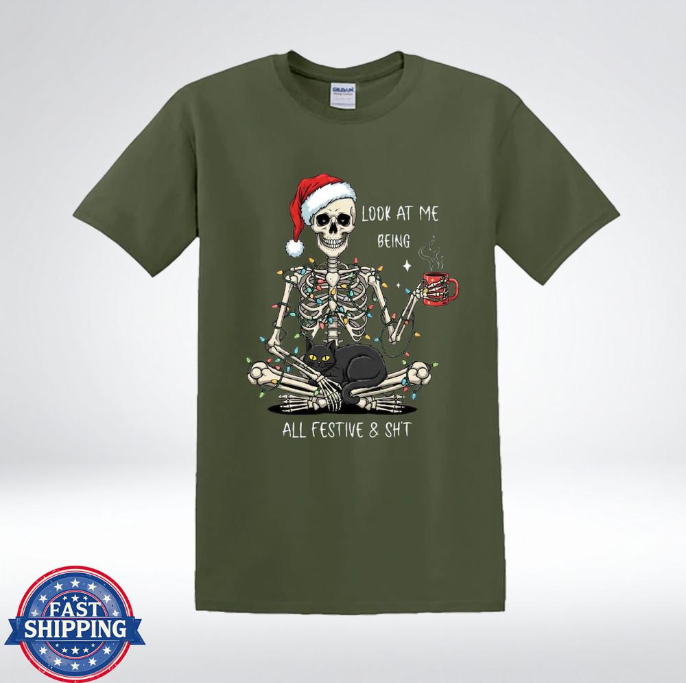 Santa Hat Skeleton With Black Cat Funny Festive and Sh*t Christmas Humor T-Shirt