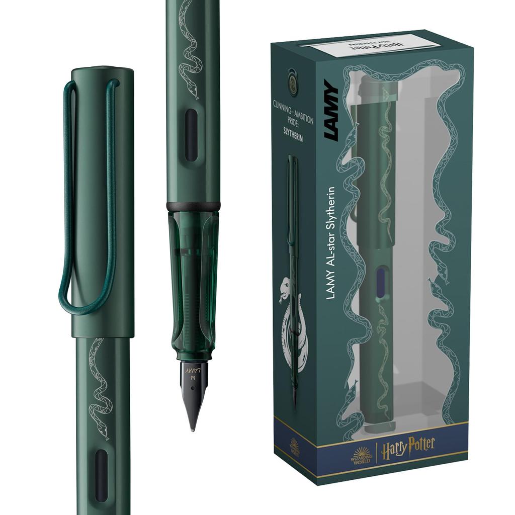 Experience the magic of the Harry Potter series with the LAMY AL-star Fountain Pen, Slytherin Special Edition. This uni-pen boasts a sleek, lightweight aluminum body with a striking green anodized finish and is adorned with the iconic Slytherin emblem. The pen features a comfortable resin grip, making it ideal for beginners and experienced writers alike. It features an extra-fine, replaceable black steel nib for a smooth writing experience. It comes with a blue LAMY ink cartridge, so you can start writing right away. Measuring 6cm wide, 16cm long, and 6cm high, and weighing just 199g, this pen's comfortable, portable design makes it ideal for calligraphy and a must-have for Harry Potter fans and writing enthusiasts.