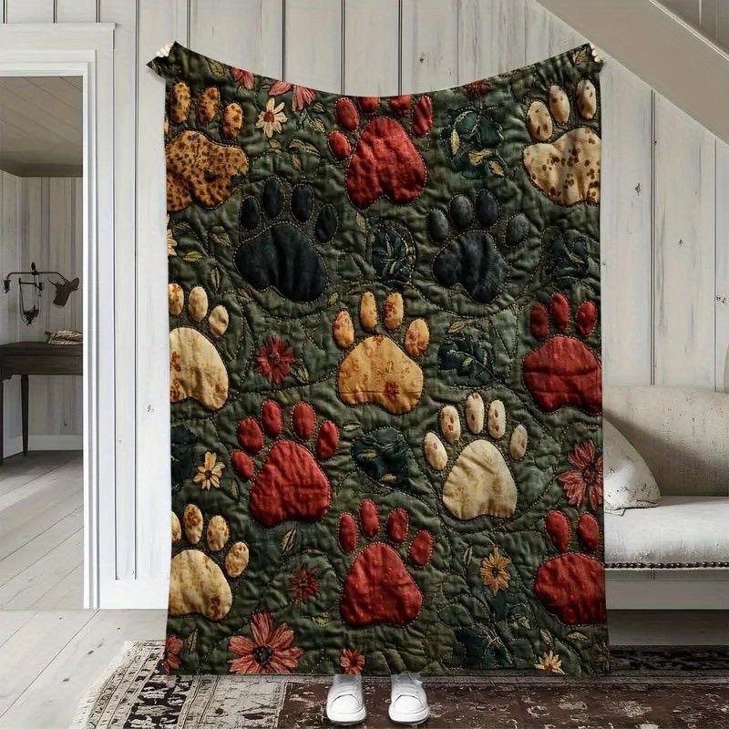 1pc Vintage Paw Print And Floral Quilted Flannel Blanket - Soft And Comfortable All Seasons Throw for Sofa Bed Car Office