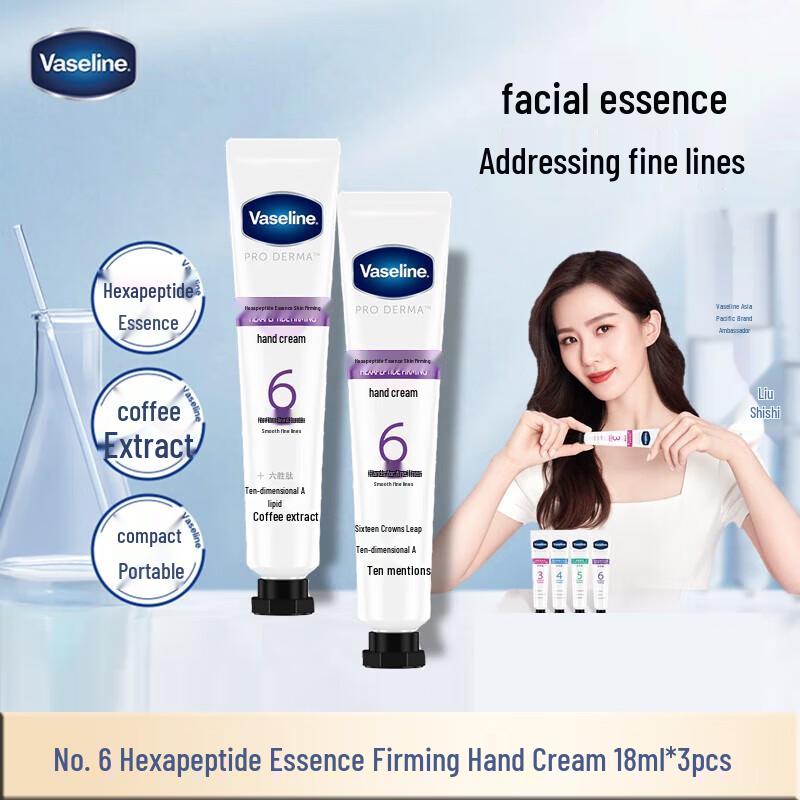 Experience the ultimate hand care with Vaseline No.6 Hexapeptide Firming Hand Cream. This set includes three 18ml tubes, formulated to deeply hydrate, moisturize, and nourish your hands, preventing dryness and chapping. The hexapeptide essence helps to firm and smooth your skin, leaving your hands soft and rejuvenated.