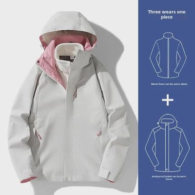 Women's 3-in-1 Windproof Waterproof Jacket with Plus Velvet Lining, Thickened for Autumn/Winter, Men's Contrast Color Mountaineering Style.