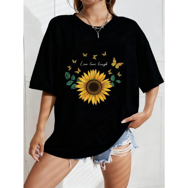 White Sunflower Print T Shirt With Butterflies And Text For Casual Wear