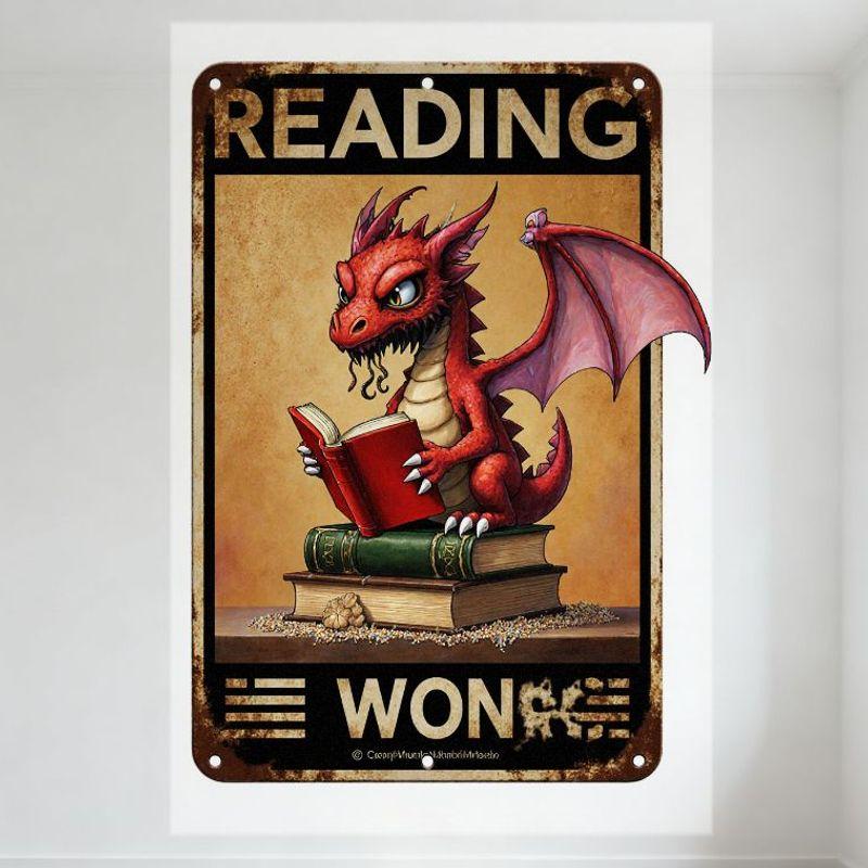 Vintage Rustic Metal Tin Sign - 'READING WON' with Dragon & Books Design for Home Bar Man Cave Decor
