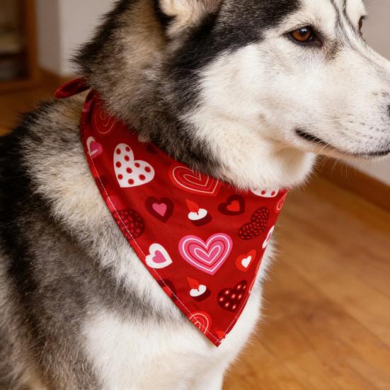 Stylish Valentine's Day Design: Featuring delicate love heart prints and vibrant colors, this triangular bib adds a festive touch to your pet's wardrobe. The charming Valentine's Day elements make your furry friend stand out during celebrations and special occasions.