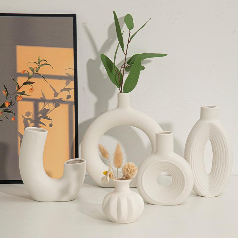 INS Ceramic Vase White Nordic Vase Circular Hollow Ceramic Donuts Flower Pot Decorative Dry Flower Vases Living Room Decoration