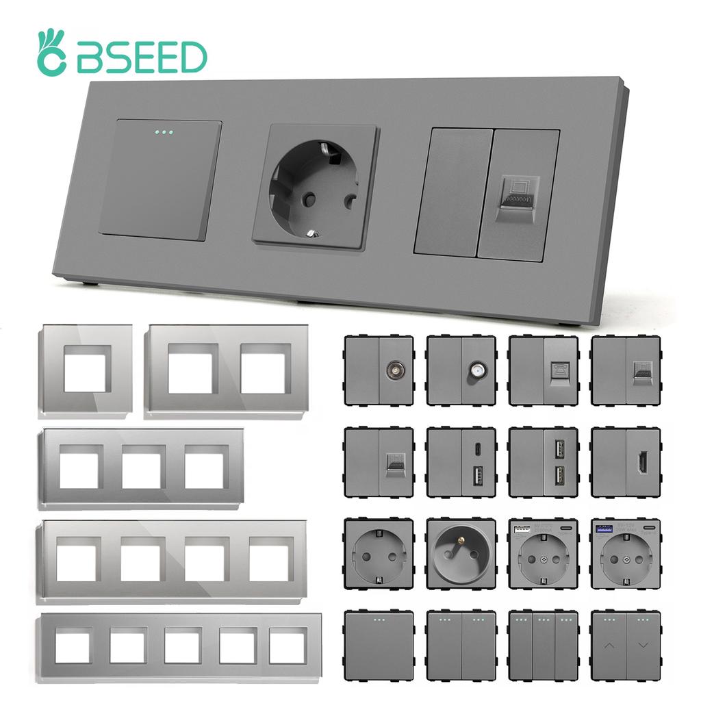BSEED Mechanical Button Switches TV ST RJ45 Internet CAT5/6 Sockets EU French USB-C Wall Power Socket Glass Frames DIY Parts