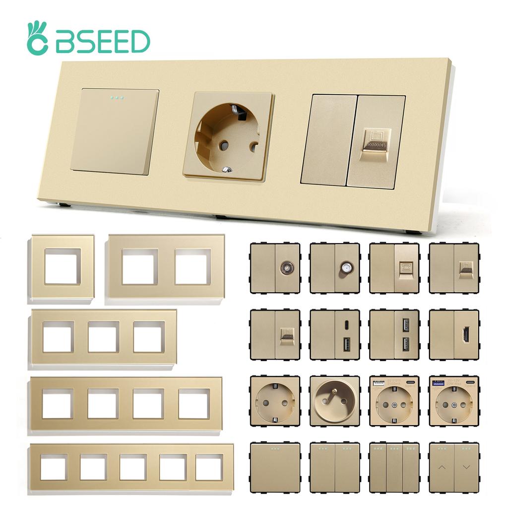 BSEED Mechanical Button Light Switches 1/2/3Way Half TV RJ45 ST Plug EU FR Wall Sockets USB Type-c Ports DIY Parts Glass Frames