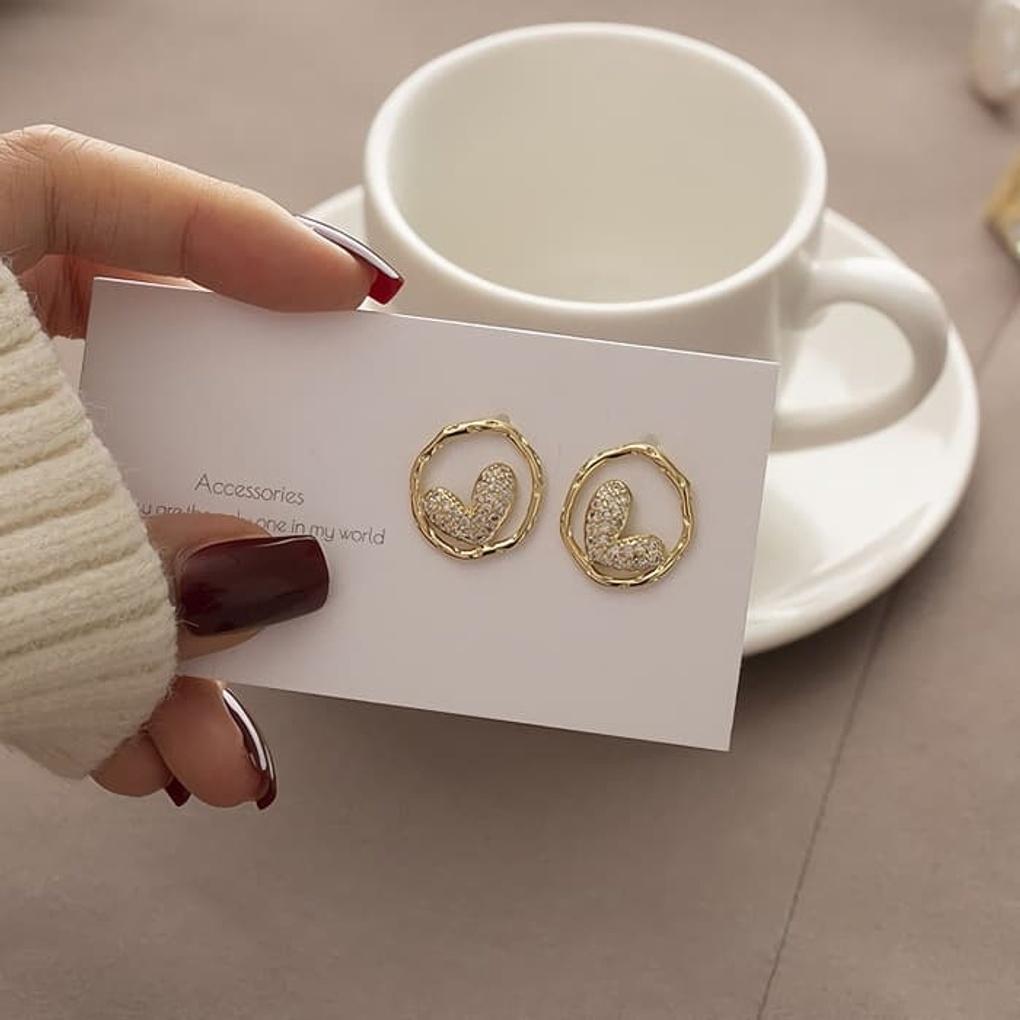 Silver Needle Earrings, Chain, Daily Circle Cubic Heart