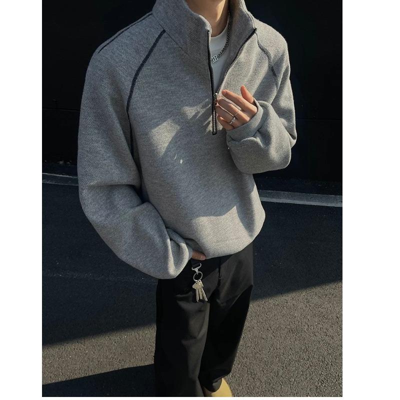Half Zipper Turtleneck Striped Sweater Men's Spring Cleanfit Heavy American Short Jacket Loose Pullover Top