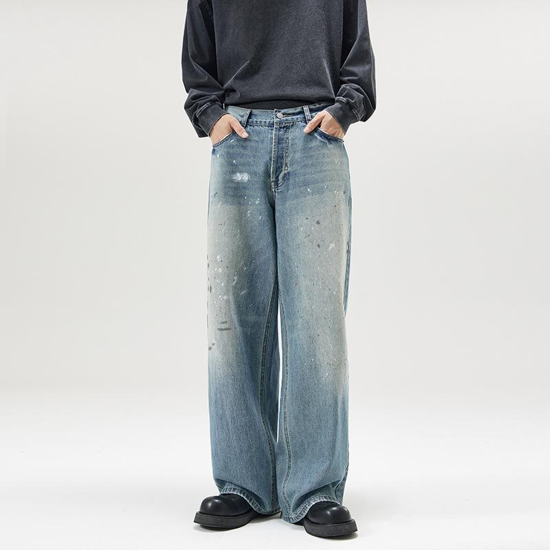 Retro Ink Splashing Print Jeans Men's Old Washed Loose Casual Autumn American High Street Straight Trousers