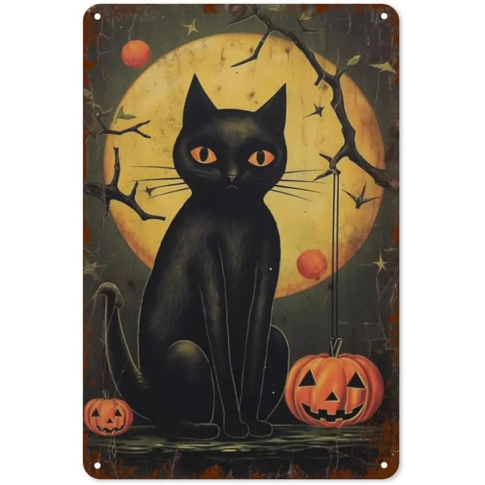 HalloweenBlackCatVintSign Vintage Halloween Tin Sign 8x12" - Rectangular Metal Wall Decor, Retro Black Cat Home Poster