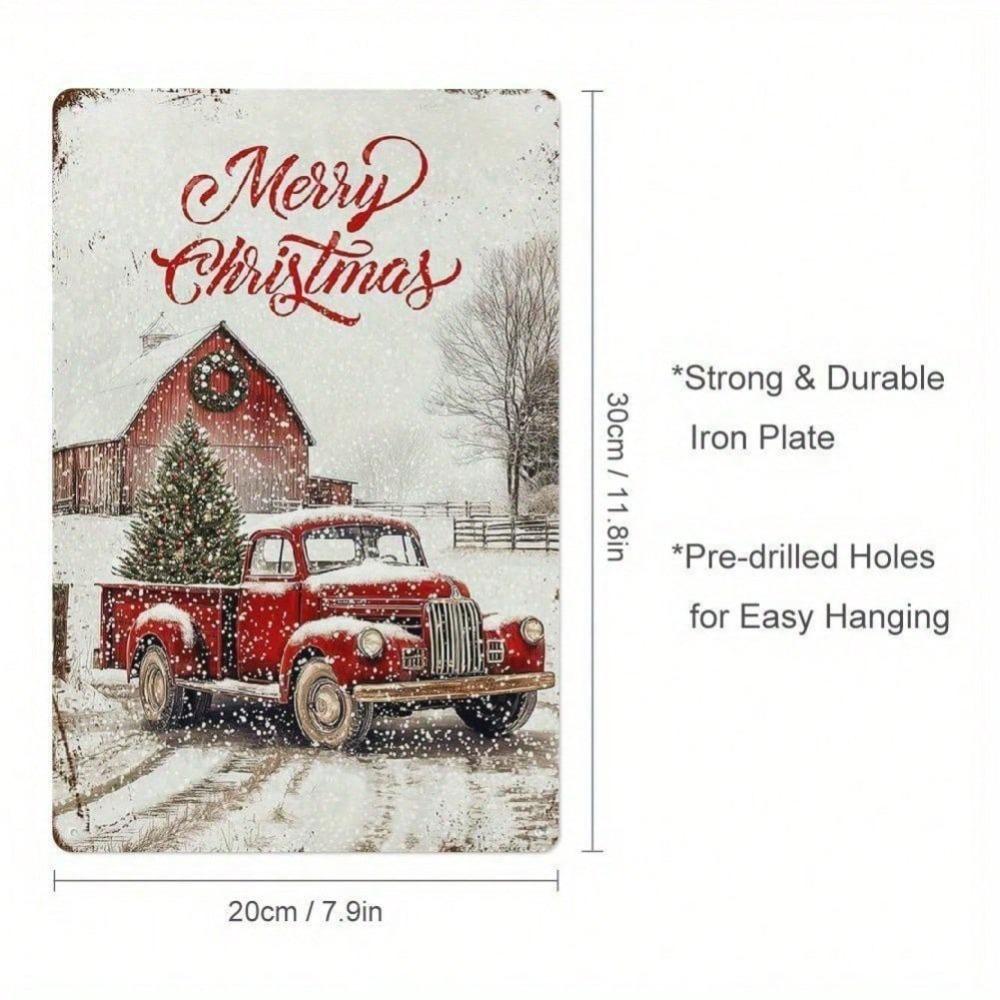 Vintage Merry Christmas Red Truck Metal Tin Sign 12x8 Inch, 2D Flat Rustic Snowy Wall Plaque for Home Yard