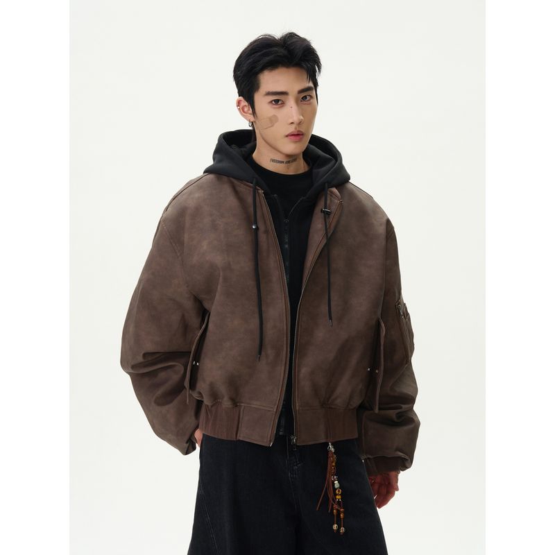 Kisko American Retro Bomber Faux Two-Piece Oversized Jacket for Men and Women Vibe Thickened Hooded Cotton Coat Trendy