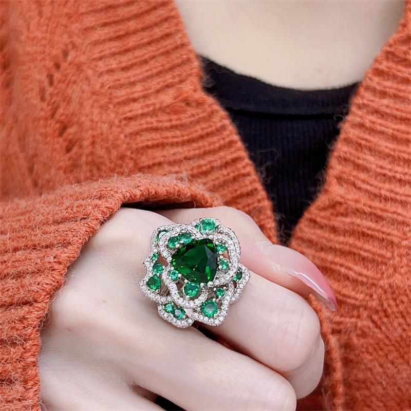 Exquisite Emerald Gemstone Opening Ring Luxury Flower Design Female Temperament Anniversary Jewelry Gift
