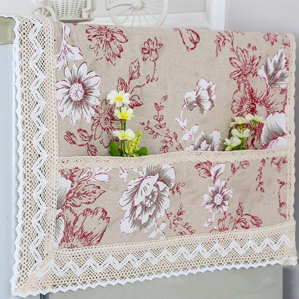 Cotton Linen Refrigerator Dust Cover with Pocket Printed French Door Refrigerator Cloth Lace Trim Fridge Protection Cover