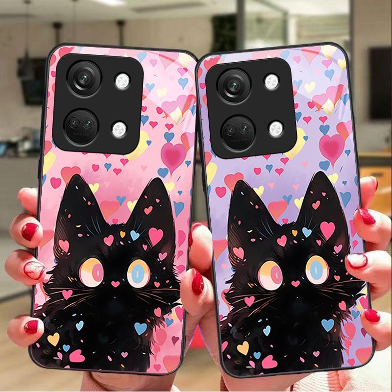 Cute Little Cat For OnePlus Nord 3 5 6T 7 Pro 8 12 10T Reno8 Lite 5G 10R Nord N30 Hard Shell Tempered Glass Phone Case Black