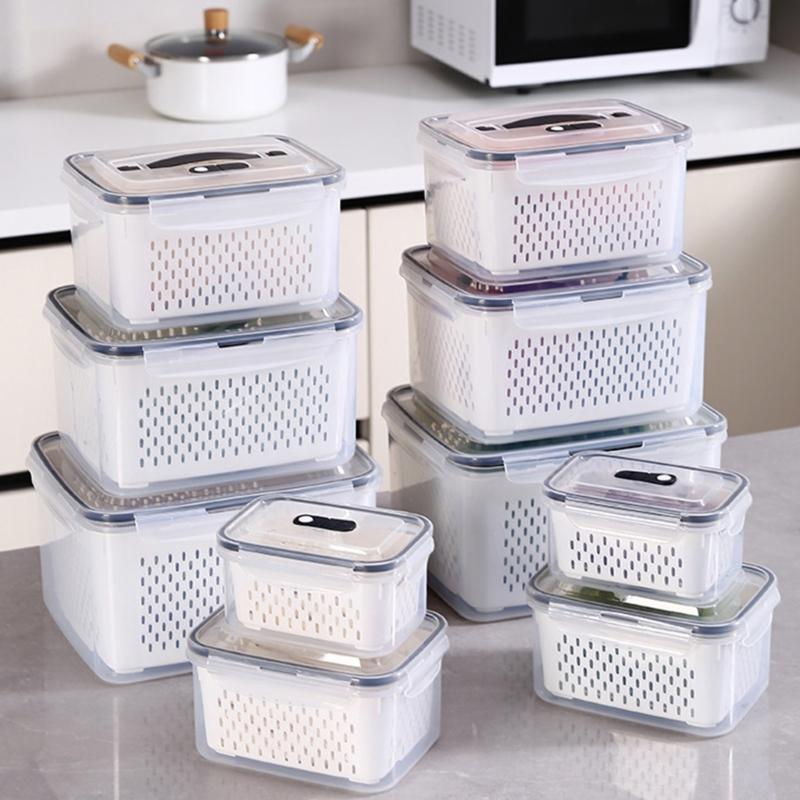 Keep your fruits, vegetables, and meats long time use with our Large Fruit Container for Fridge featuring airtights seals and removable colanders for food storage.